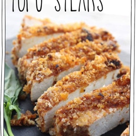 Dip the tofu steaks in the tomato paste mixture, and use a spoon or fork to help spread a thick layer of the sauce on the tofu. Now dip the sauced tofu steak into the breadcrumbs and use your hand to help pat the breadcrumbs onto the tofu. Repeat with remaining tofu pieces.