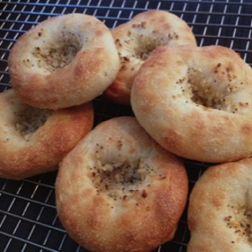 5. When the bialys have risen, use your finger to make in indentation in the middle of each of them, leaving roughly a 1-inch border of puffed dough around the edges and making sure not to poke through the dough. Prick the indented parts with a fork to prevent them from rising too much in the oven and spoon the onion filling into the indentations. If you like, brush the puffed rim with a little water and sprinkle with poppy seeds and salt.