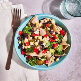 Add beans, bell pepper, avocado, cotija and jalapeños to the pasta and corn in the large bowl; toss to combine. Add the vinaigrette; mix until well coated.