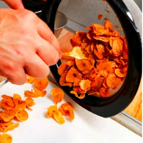 Heat the vegetable oil in a sauté pan over medium-high heat until the oil begins to shimmer. Add the sliced garlic and fry, stirring constantly, for 5 minutes or until light golden brown. Using a mesh strainer, drain the garlic from the hot oil.