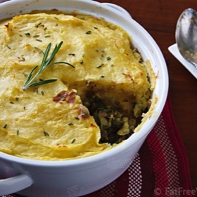 Remove baking dish from oven. Spoon potato mixture over all and gently spread it out evenly. Bake 20 minutes to set potatoes, then broil 1 to 2 minutes to brown the top.